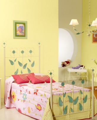 Cama realizada en forja artesanal, pintada al horno y decorada con pátinas a mano. Los adornos de la flor están acabados con patina de verde. Este modelo es ideal para el dormitorio de los más pequeños.