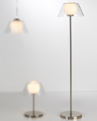 Lámpara de pie realizada en cristal y acero cromado. Este modelo es disponible en varios colores.