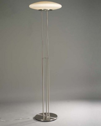 Lámpara de pie realizada en acero niquel y con tulipa de cristal. Este modelo es ideal para los ambientes en línea moderna.